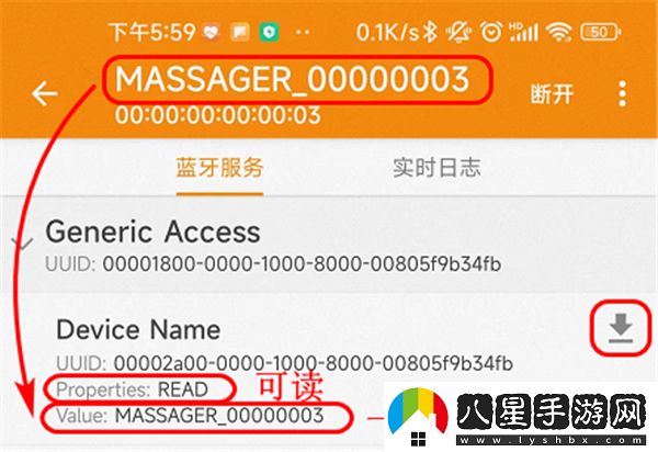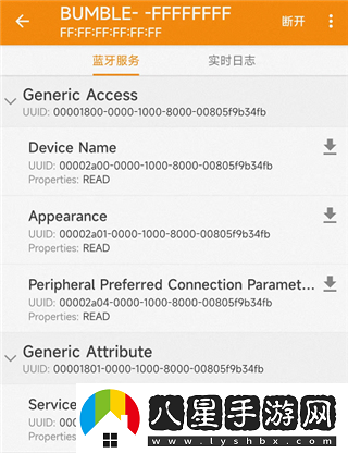 4、比如服務(wù)Generic Access里面有個(gè)特性是Device Name 設備名,屬性Properties為Read可讀,界面有個(gè)向下的箭頭代表download,點(diǎn)擊就能讀出Value,和最上面的藍牙名稱(chēng)是一致的;