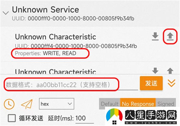 5、對于屬性Properties為Write可寫(xiě)的特性,點(diǎn)擊向上的箭頭upload可對此Characteristic進(jìn)行寫(xiě)數據,然后點(diǎn)擊發(fā)送;