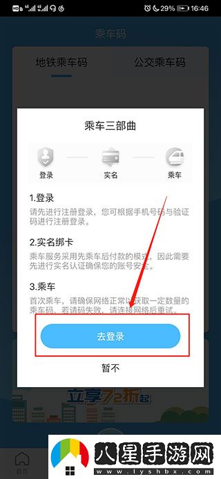 3、登錄后繼續點(diǎn)擊“去實(shí)名”,綁定個(gè)人銀行卡或信用卡后,即可生成東莞通乘車(chē)碼;