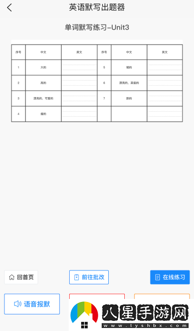 英語(yǔ)默寫(xiě)出題器提供英語(yǔ)單詞的的下載、打印、語(yǔ)音默寫(xiě)和在線(xiàn)練習功能,專(zhuān)門(mén)為廣大用戶(hù)們打造的,為大家提供英語(yǔ)默寫(xiě)功能,讓大家可以隨時(shí)開(kāi)始練習,提高自己的英語(yǔ)聽(tīng)寫(xiě)能力,ai讀報,讓大家可以更容易聽(tīng)清楚,十分好用,并幫助大家記錄錯題,方便大家復習!