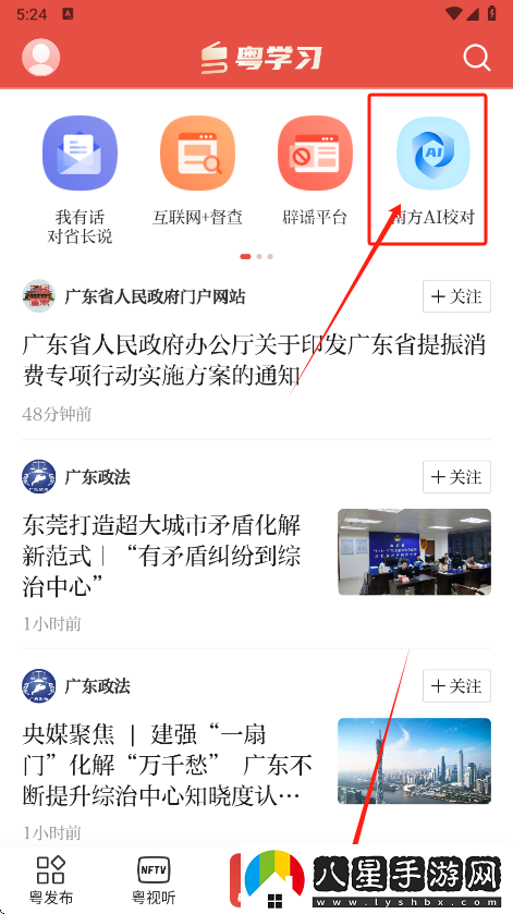 1、在底部導航欄切換到粵政通,然后在上方找到南方AI校對,如圖所示